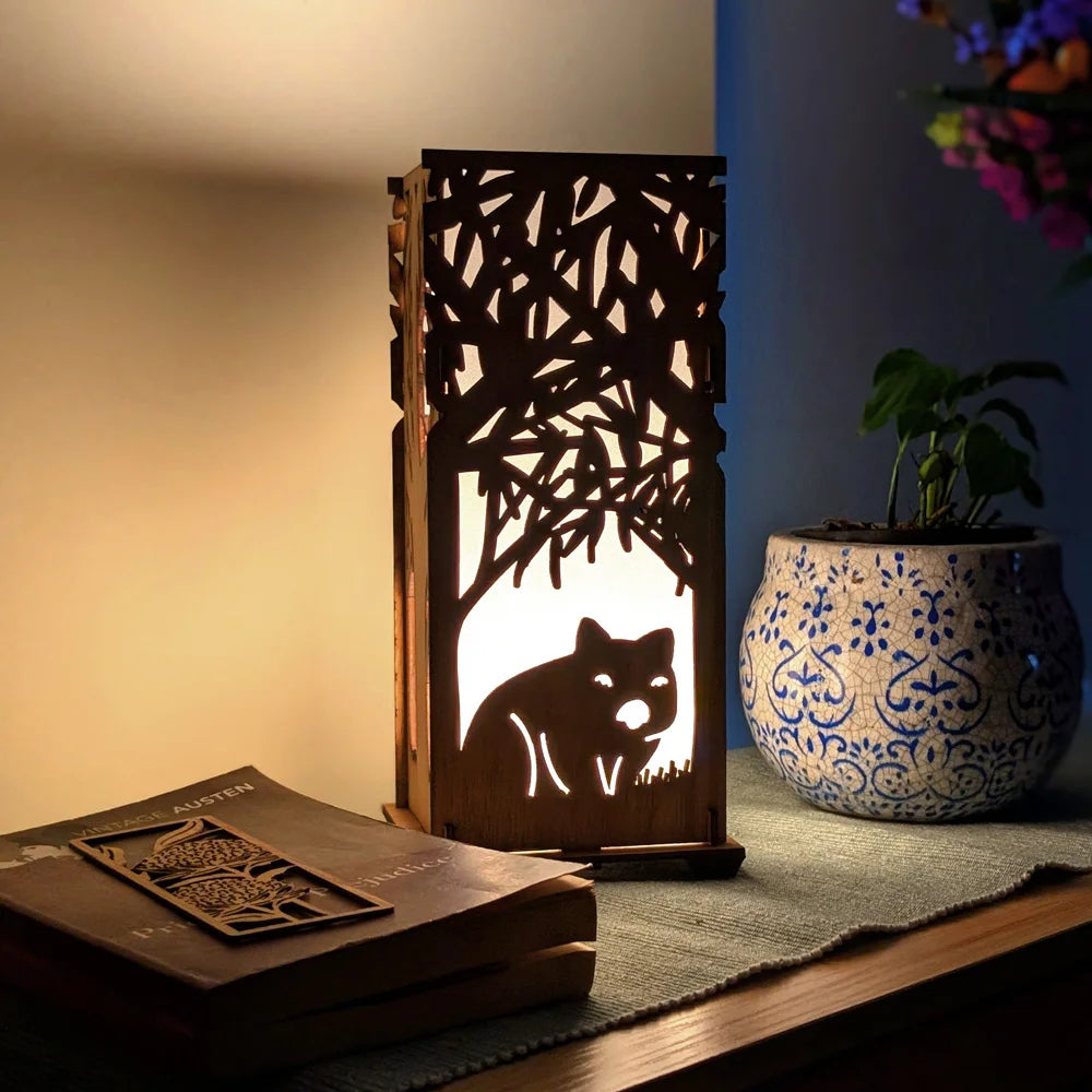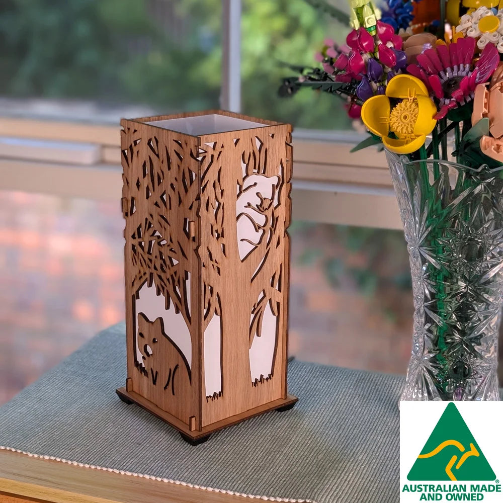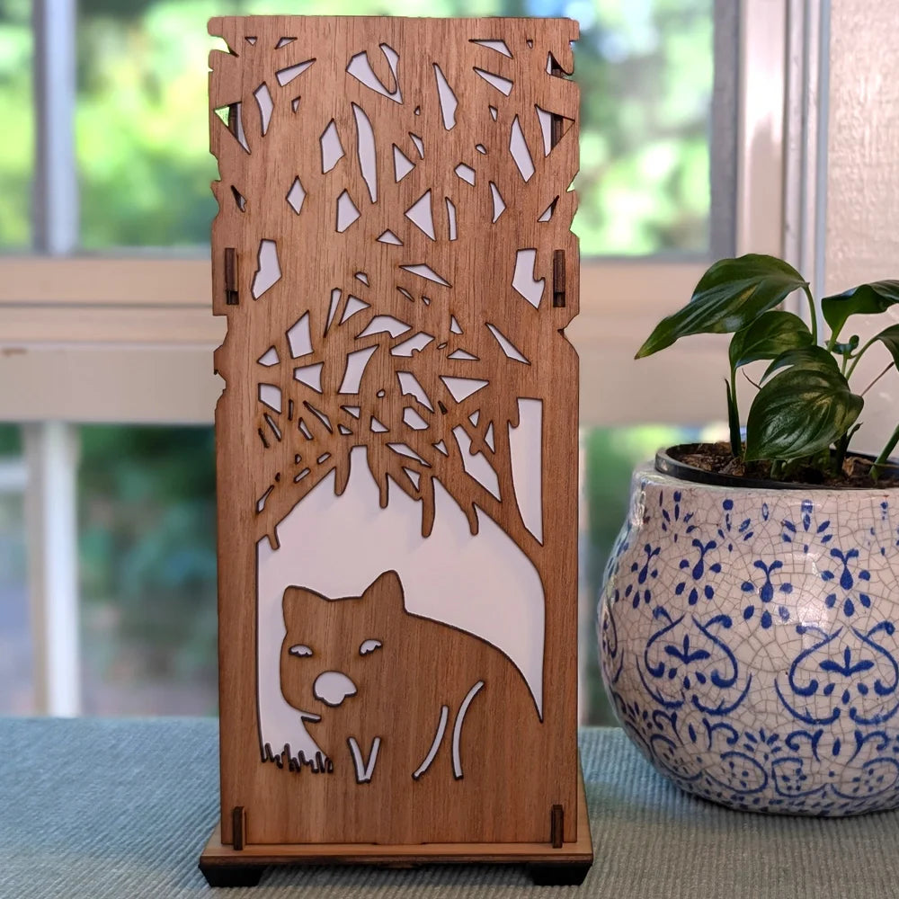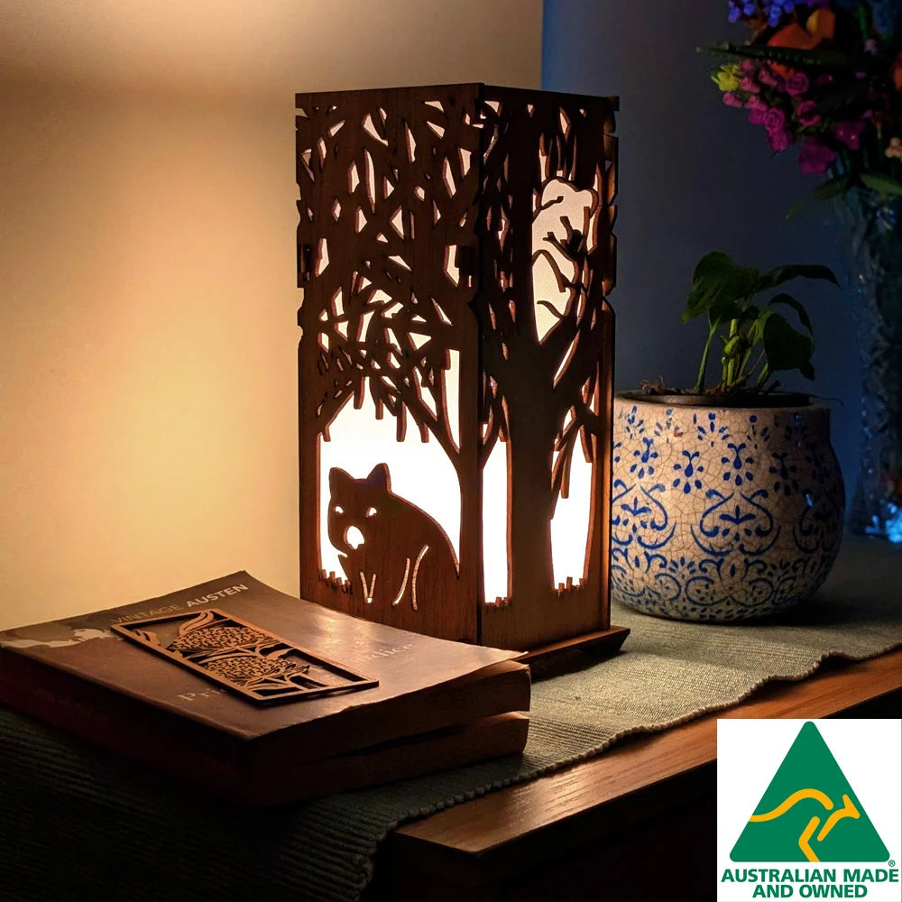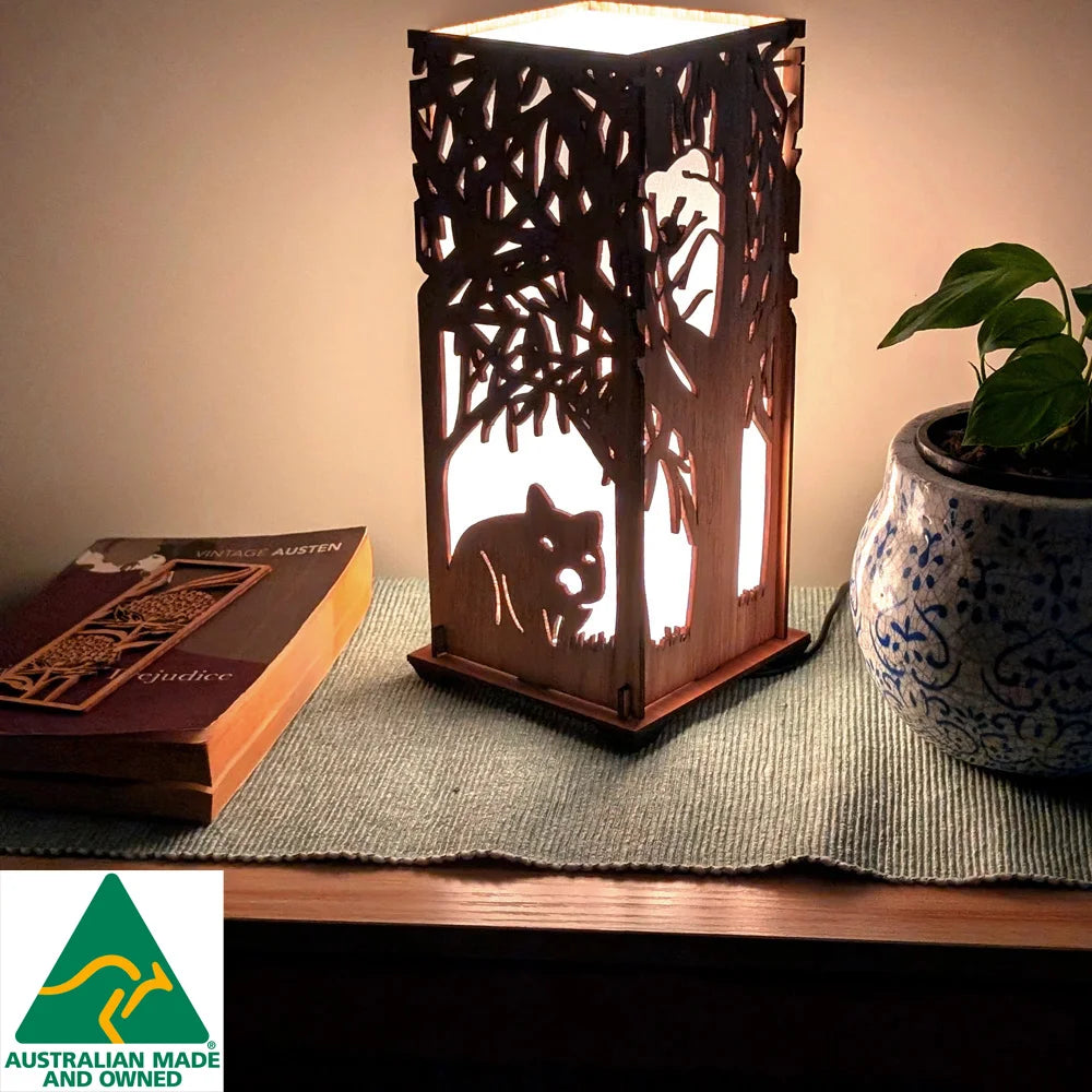 Koala and Wombat: Australian Hardwood Lamp. Designed and made in Australia, from Australian hardwood, 12 x 12 x 26.5cm.